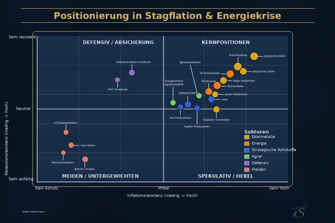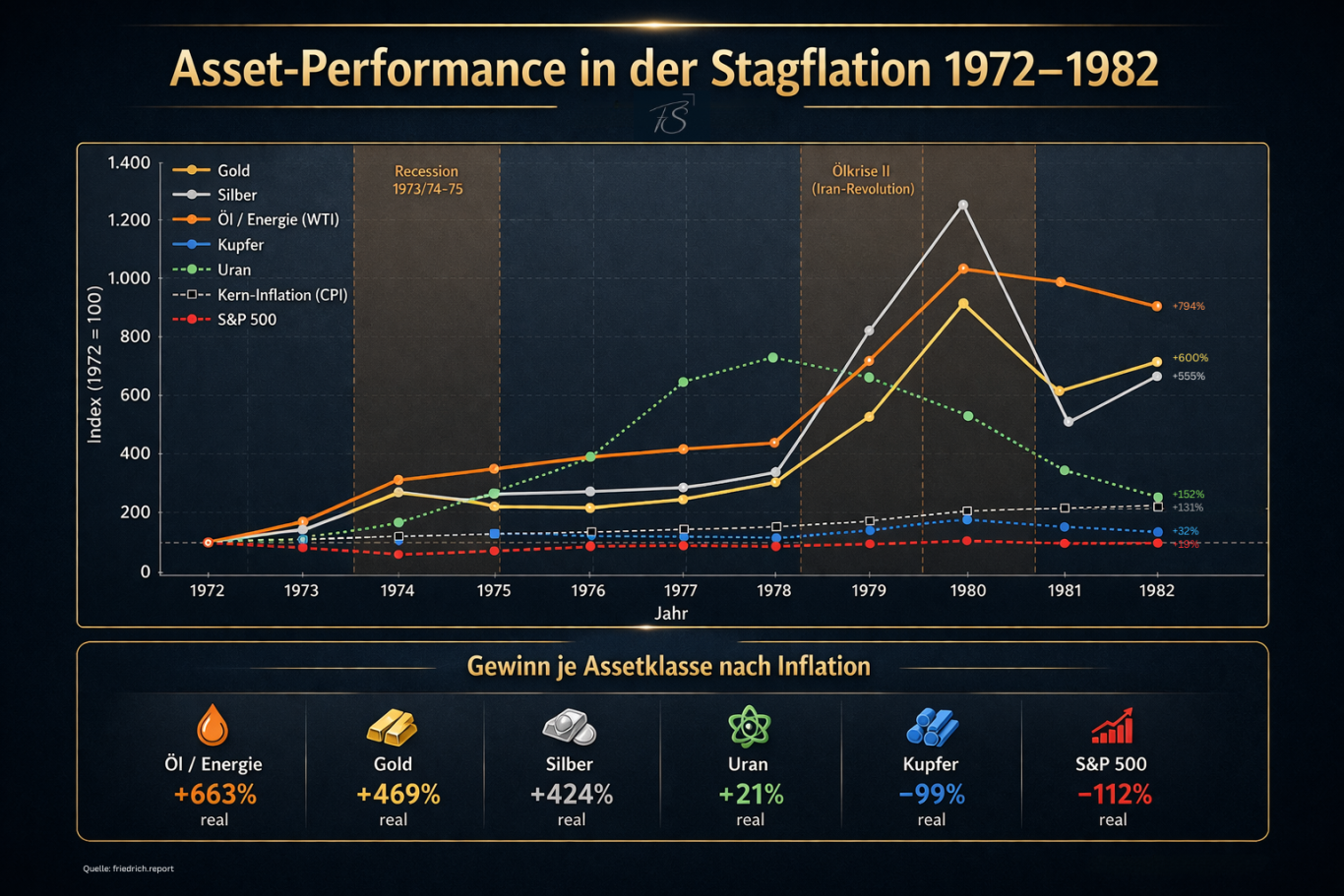 Die historische Erfahrung zeigt damit ein klares Muster: In einem stagflationären Umfeld mit steigenden Energiepreisen profitieren vor allem Rohstoffe und Edelmetalle, während viele klassische Finanzwerte real unter Druck geraten.