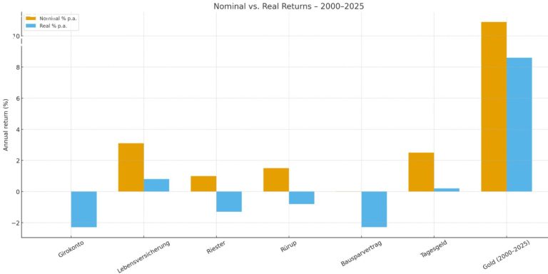 Inflationsannahme: 2,3 % p.a. Nominale Durchschnittswerte basieren auf Branchenberichten (Assekurata für Lebensversicherungen), Marktdaten für Riester/Rürup/Bausparen/Tagesgeld sowie historischen Goldpreisen (World Gold Council/VisualCapitalist). Girokonto: 0 % Verzinsung betrachtet.
