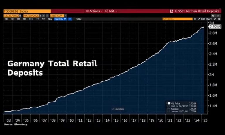 Die ergänzende Bloomberg-Grafik (Abbildung 2) belegt, dass deutsche Haushalte heute so viel Geld auf Girokonten halten wie selten zuvor. Die Gesamteinlagen liegen bei fast 3 Billionen Euro.